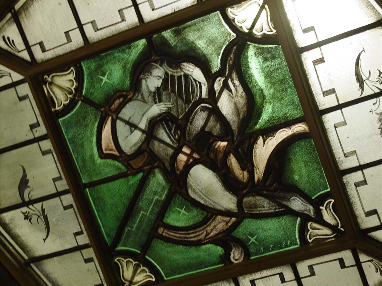 Bruno Tuukkasen (1891-1979) taidonnäyte Orfeus lasimaalaus kuvaa antiikin Kreikan rakkauden laulajaa ja orfilaisen uskonnon perustajahahmoa, ”laulun isää”.